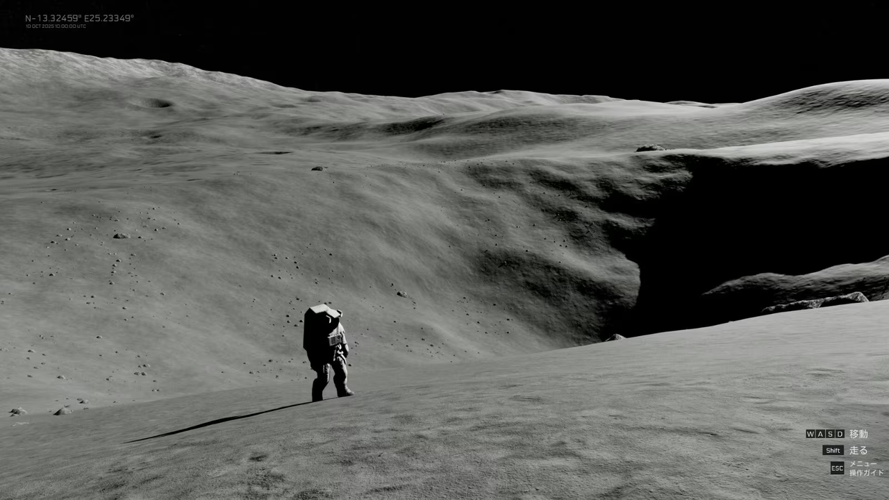 開発チームによると、月面の再現には実際の観測データや科学研究の成果を活用しています。高精細の DEM(数値標高モデル)による地形データ、自然に生成される岩の分布、太陽・地球・月の位置に合わせた光の変化など、現実の月面に近い環境をシミュレーションしています。